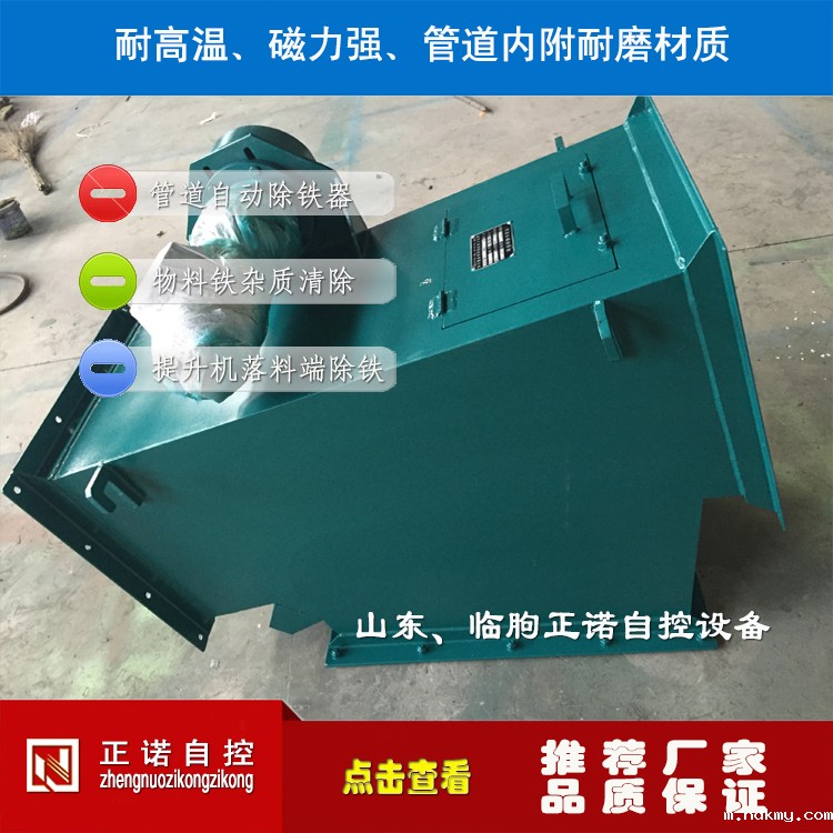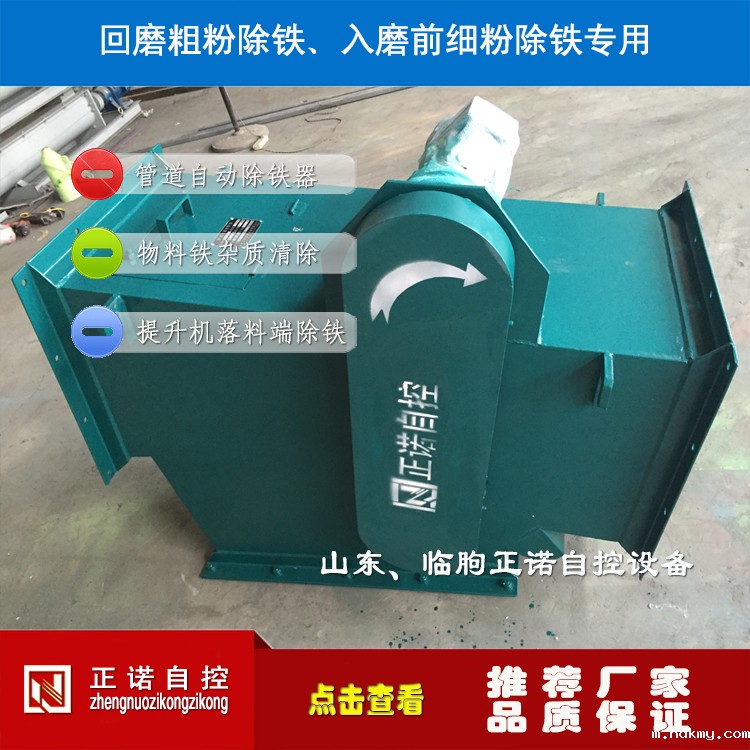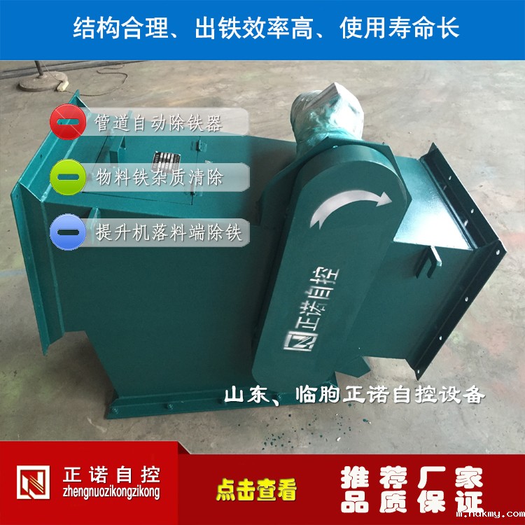 变形壳转动为磁系运转,从结构上加大了磁系的作用过程,配以独特的分离机构,铁杂物分享更彻底。采用耐高温、强磁力的钕铁硼磁材,磁场强度高。整机串接于粉料输送管道中,法兰式联接,安装方便。除铁、卸铁自动完成,设备运转无需专人看管。永磁体做磁源,无需耗电,小功率电力排渣,耗电极低,结构紧凑,工作稳定可靠。
